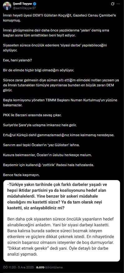 “Ben daha çok siyaseten sürece öncülük yapanların hedef alınabileceğini anladım. Yani bir siyasi darbeyi kastetti. Bana kalırsa burada sadece süreci bozmak isteyen etkenlere ve güçlere dikkat çekmek istedi. En nihayetinde sürecin başarısız olmasını isteyenler de boş durmuyorlar. “Dikkat etmek gerekir” dedi yani. Öyle detaylı bir darbe analizi yapmadı.”