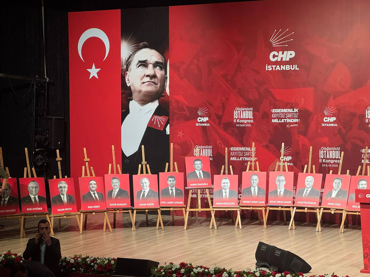 Sahneye, yaşamını yitiren eski CHP Genel Başkanlarından Altan Öymen ile tutuklu bulunan partililer Ekrem İmamoğlu, Aykut Erdoğdu, Baki Aydöner, Hasan Mutlu, İnan Güney, Özgür Kabadayı, Hasan Akgün, Utku Caner Çaykara, Hakan Bahçetepe, Mehmet Murat Çalık, Resul Emrah Şahan, Alaattin Köseler, Ahmet Özer ile Rıza Akpolat’ın resimlerinin yer aldığı şövaleler bırakıldı.