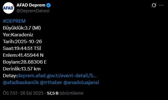 Afet ve Acil Durum Yönetimi Başkanlığı (AFAD) internet sitesinde yer alan bilgilere göre, Karadeniz’de 3.7 büyüklüğünde bir deprem kaydedildi. Depremin saat 19:44’te meydana geldiği ve 13,57 kilometre derinlikte olduğu belirlendi.