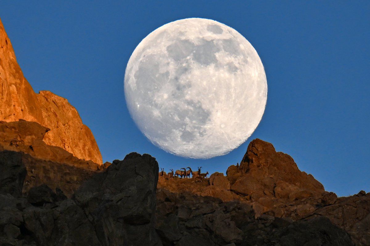 Dağların en tepesinde toplanan yaban keçileri, tam da süper dolunayın ışığı altında silüetlerini oluşturdu.